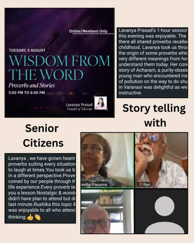 The proverbs we heard as children to the proverbs that have instilled in us the values we carry, Talescope’s “Roots project with seniors” explored proverbs from the perspectives of our senior friends. A wisdom filled session both for the participants and the facilitator.